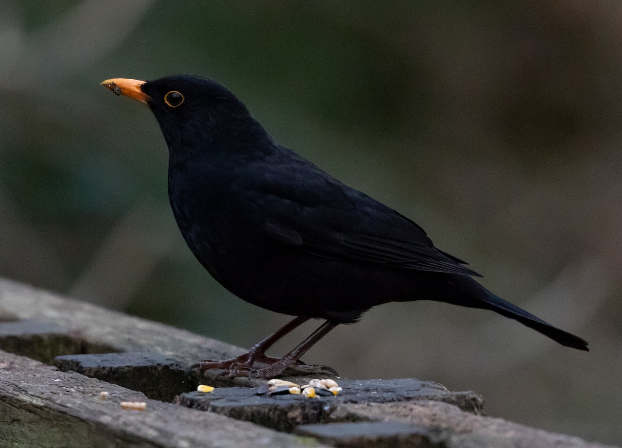 Naturally, the male Blackbird is primarily black in colour. The males also have an orange beak and yellow ring around the eyes. The females are more brown in colour. Their song is quite distinctive, as well.